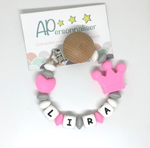 Attache tétine couronne rose pâle gris coeur à personnaliser