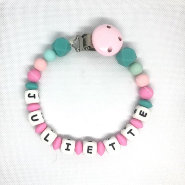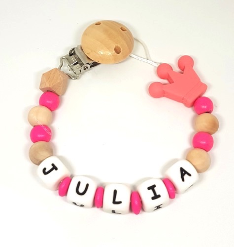 Attache tétine couronne fuschia Lola rose bois personnalisée