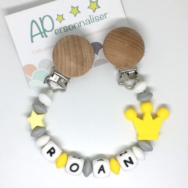 Attache tétine couronne 2 jaune gris coeur à personnaliser
