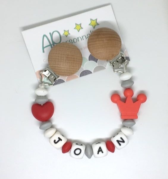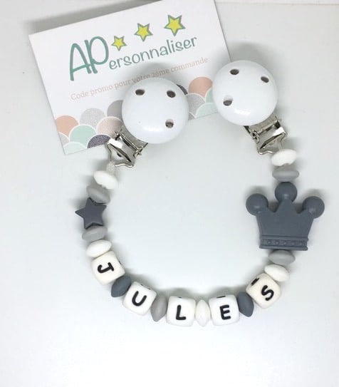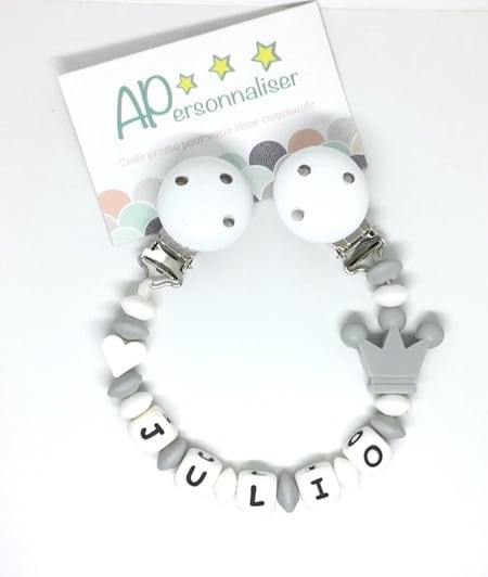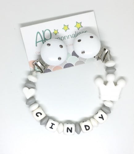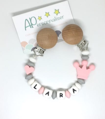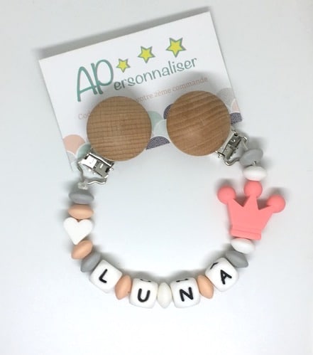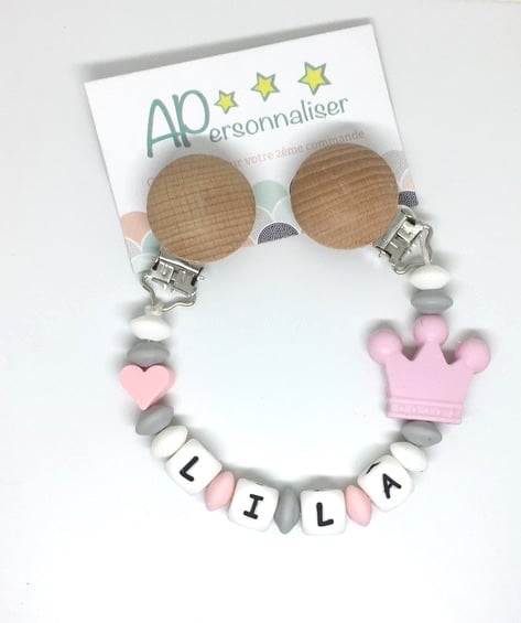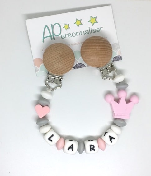 Attache tétine couronne rose gris coeur à personnaliser