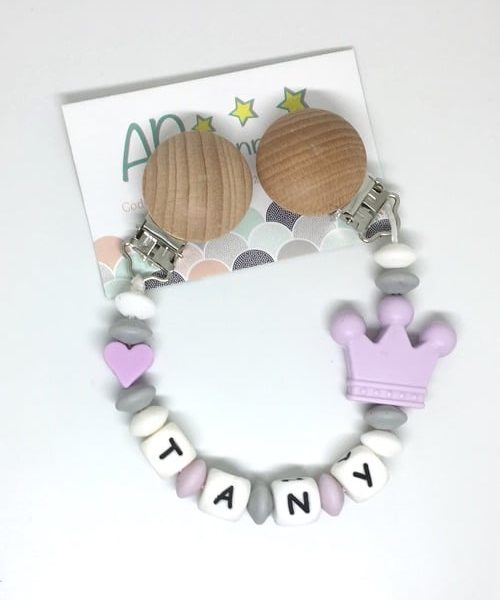 Attache tétine couronne violet gris coeur à personnaliser