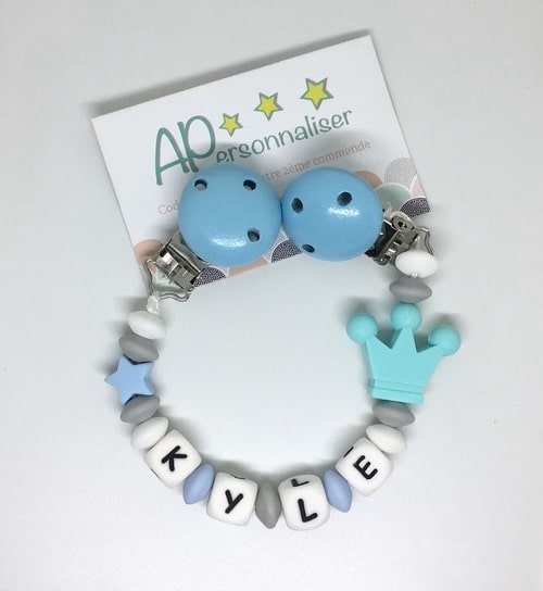 Attache tétine couronne Théo bleu bois personnalisée