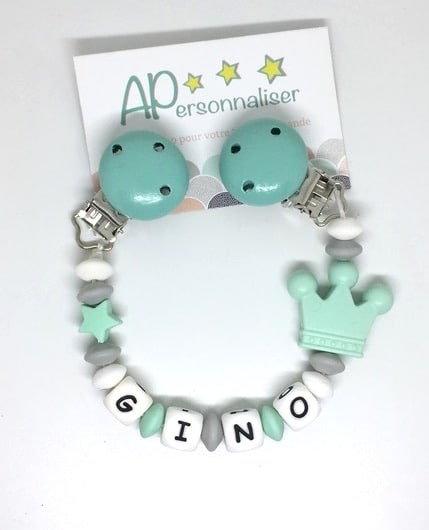 Attache tétine couronne verte gris coeur à personnaliser