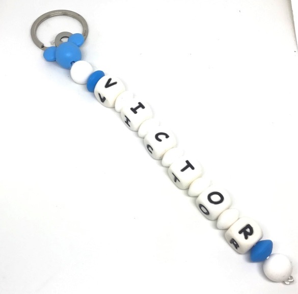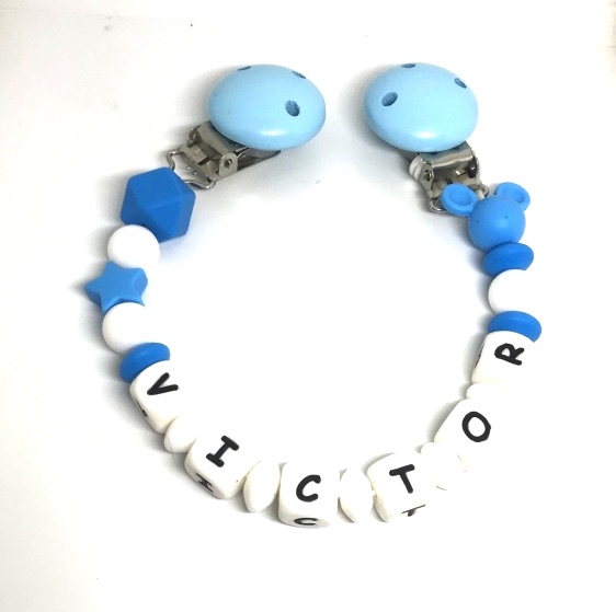 Attache tétine Hugo souris bleu verte doré or personnalisée
