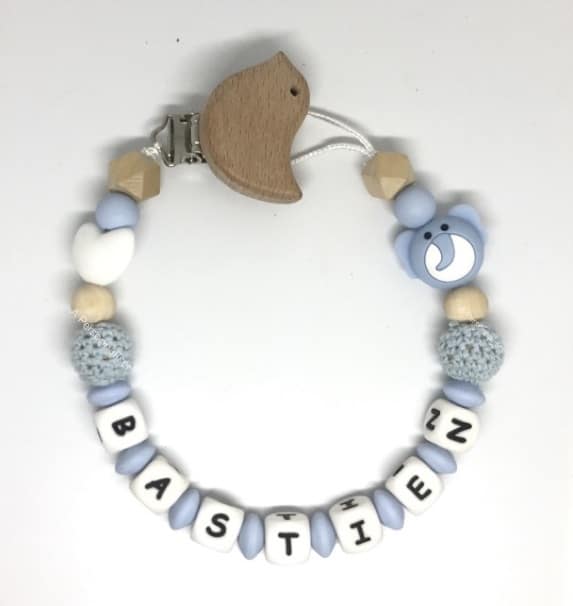L’accroche tétine éléphant bleu prénom est composé de perles de dentition :
