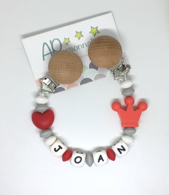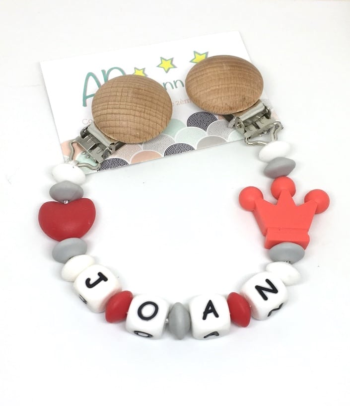 L’attache doudou couronne rouge coeur à personnaliser est composé de perles de dentition :