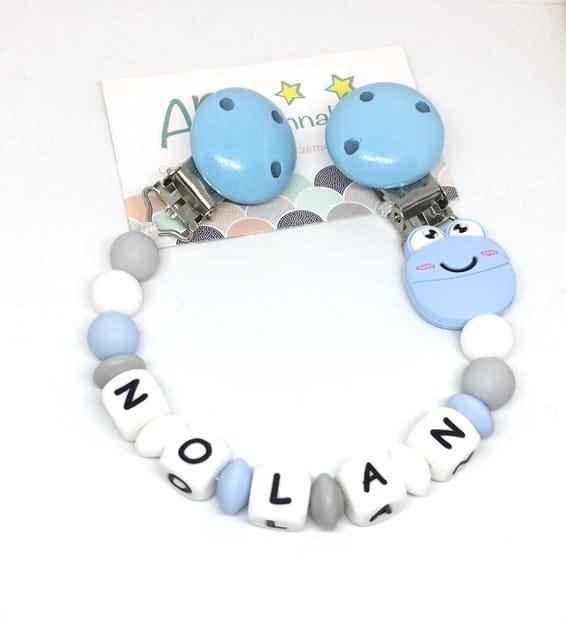 L’attache doudou grenouille bleu grise avec prénom Nolan est composé de perles de dentition :