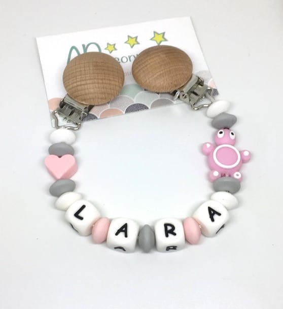 L’attache doudou tortue rose pâle gris coeur à personnaliser est composé de perles de dentition :