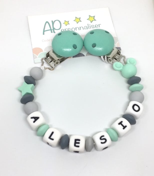 L’accroche doudou turquoise gris souris mickey prénom Alésio est composé de perles de dentition :