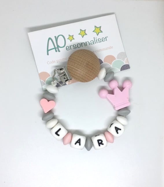 L’attache tétine couronne rose coeur à personnaliser est un cadeau original et unique à offrir pour une naissance ou un anniversaire. N’oubliez pas d’indiquer le prénom lorsque vous passez commande d’une attache tétine personnalisée.