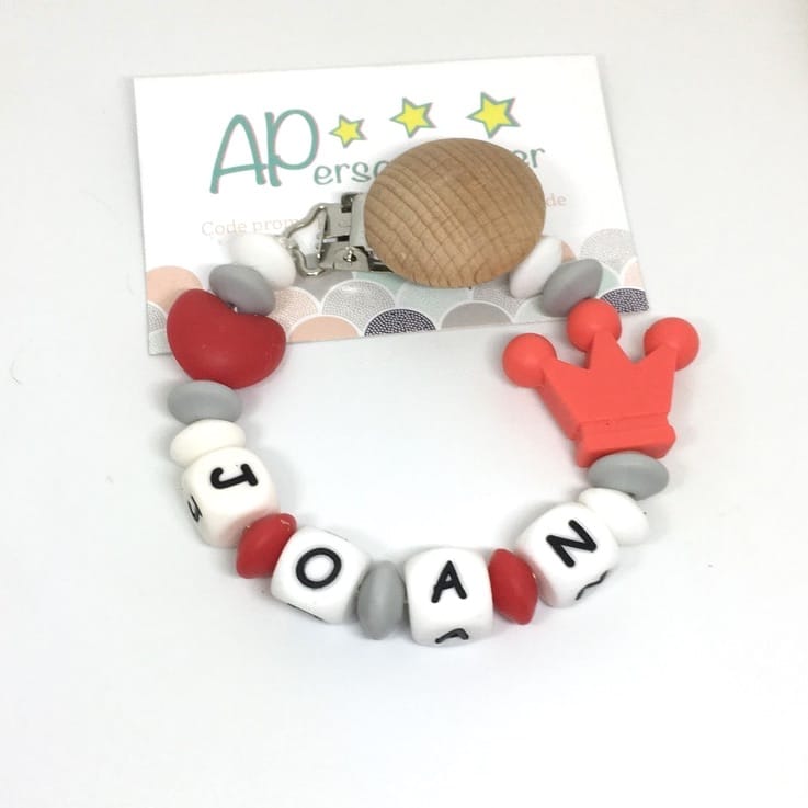 L’attache tétine couronne rouge coeur à personnaliser est un cadeau original et unique à offrir pour une naissance ou un anniversaire. N’oubliez pas d’indiquer le prénom lorsque vous passez commande d’une attache tétine personnalisée.