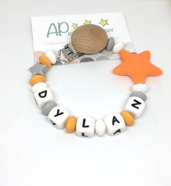 L’attache tétine étoile orange coeur à personnaliser est un cadeau original et unique à offrir pour une naissance ou un anniversaire. Noubliez pas dindiquer le prénom lorsque vous passez commande dune attache tétine personnalisée.