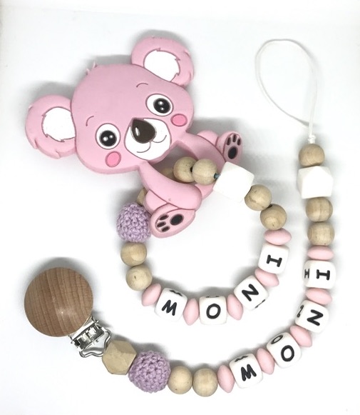 L’attache tétine rose violette et hochet de dentition koala rose personnalisé est composé de perles de dentition :