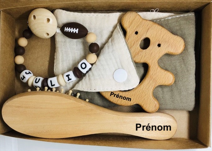 Le coffret naissance attache tetine ballon de rugby + bavoir koala + brosse avec prénom à personnaliser est un cadeau original et unique à offrir pour une naissance ou un anniversaire. N’oubliez pas d’indiquer le prénom lorsque vous passez commande d’une attache tétine personnalisée.