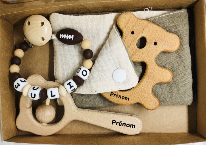 La box naissance attache tetine ballon de rugby + bavoir koala + hochet avec prénom est composé de perles de dentition :