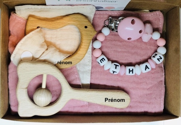 La box naissance attache tetine cochon rose + bavoir oiseau + hochet avec prénom à personnaliser est un cadeau original et unique à offrir pour une naissance ou un anniversaire. N’oubliez pas d’indiquer le prénom lorsque vous passez commande d’une attache tétine personnalisée.