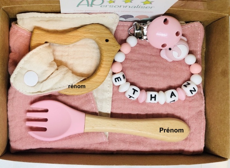 La box coffret naissance attache tetine éléphant rose + bavoir oiseau + fourchette rose est composé de perles de dentition :
