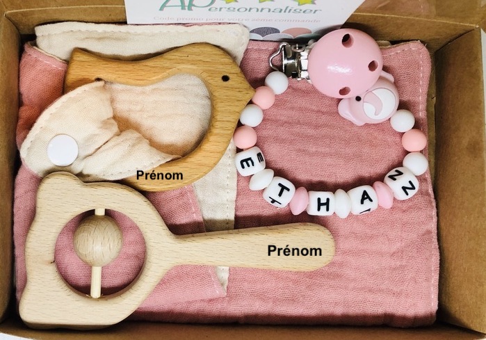La box coffret naissance attache tetine éléphant rose + bavoir oiseau + hochet avec prénom est un cadeau original et unique à offrir pour une naissance ou un anniversaire. N’oubliez pas d’indiquer le prénom lorsque vous passez commande d’une attache tétine personnalisée.