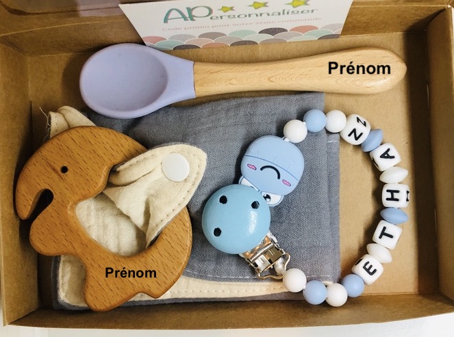 Caractéristiques coffret naissance attache tetine grenouille bleu + bavoir oiseau + cuillère bleu pâle avec prénom