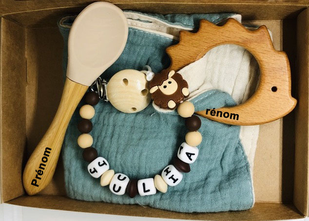 Caractéristiques Coffret naissance attache tetine mouton marron + bavoir hérisson + cuillère beige avec prénom