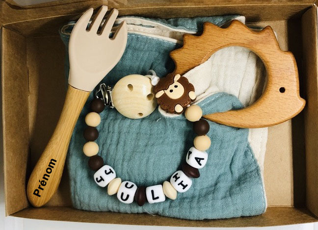 Le coffret naissance attache tetine mouton marron + bavoir hérisson + fourchette beige avec prénom à personnaliser est un cadeau original et unique à offrir pour une naissance ou un anniversaire. N’oubliez pas d’indiquer le prénom lorsque vous passez commande d’une attache tétine personnalisée.