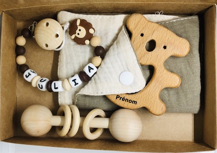 Caractéristiques Coffret naissance attache tetine mouton + bavoir koala + hochet avec prénom