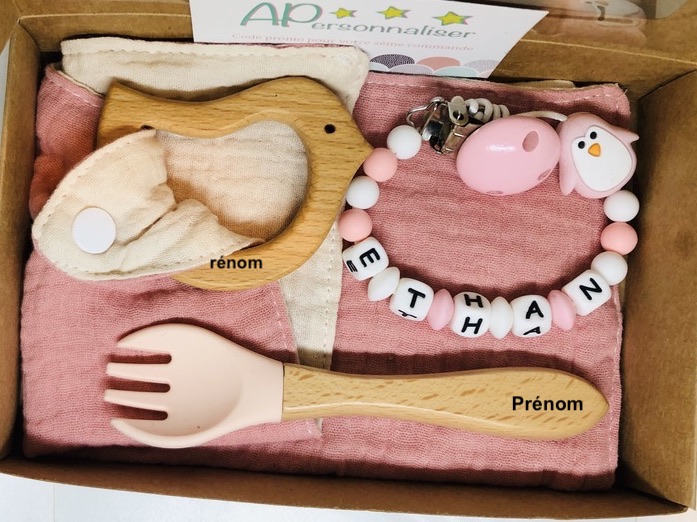 La box naissance attache tetine pingouin rose + bavoir oiseau + fourchette rose avec prénom à personnaliser est un cadeau original et unique à offrir pour une naissance ou un anniversaire. N’oubliez pas d’indiquer le prénom lorsque vous passez commande d’une attache tétine personnalisée.