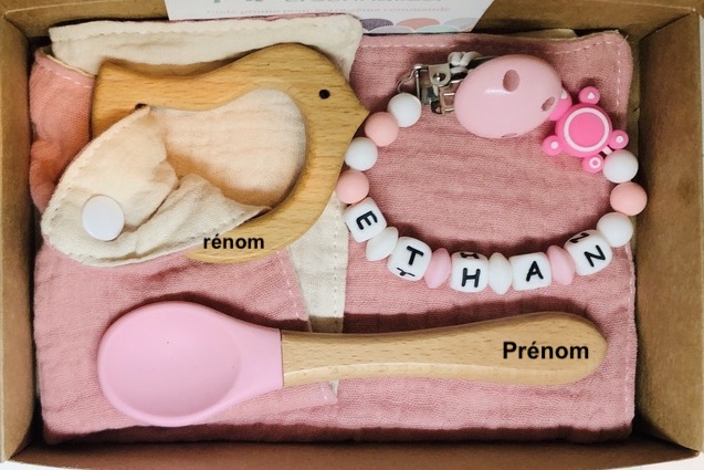 La box naissance attache tetine tortue rose + bavoir oiseau + cuillère rose avec prénom à personnaliser est un cadeau original et unique à offrir pour une naissance ou un anniversaire. N’oubliez pas d’indiquer le prénom lorsque vous passez commande d’une attache tétine personnalisée.