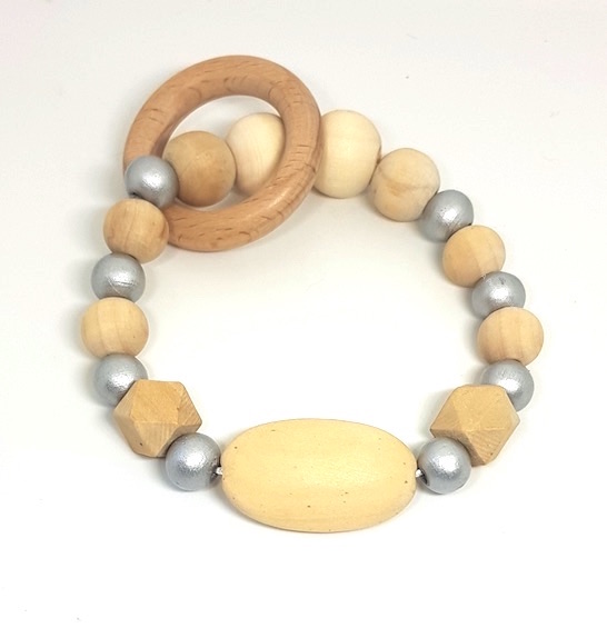 L’hochet argent en bois à graver prénom est composé de perles de dentition :