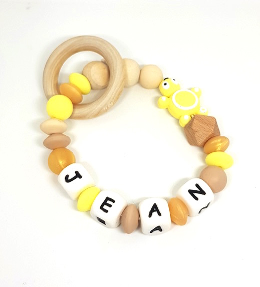 L’hochet tortue jaune marron orange Jane prénom est composé de perles de dentition :