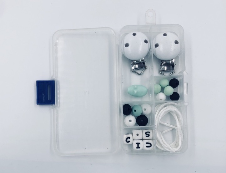 Le kit création attache doudou cochon vert à personnaliser est composé de perles de dentition :