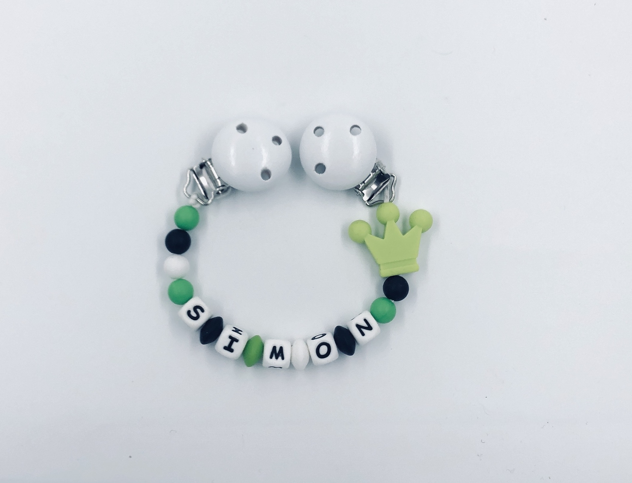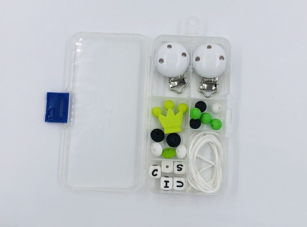 Le kit de création d’attache verte pomme couronne avec prénom est composé de perles en silicone et d’une couronne. L’attache est un clip en bois.
