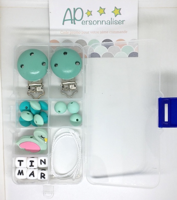 Le kit pour faire son attache doudou flamant vert à personnaliser est composé de perles de dentition :