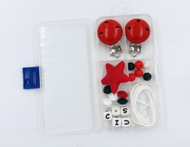 Le kit création attache doudou étoile rouge à personnaliser est composé de perles de dentition :
