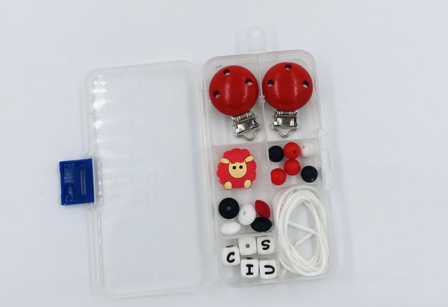 Le kit création attache doudou mouton rouge à personnaliser est composé de perles de dentition :