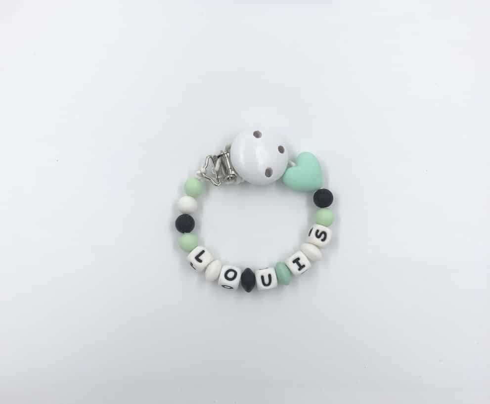 Le kit création attache sucette coeur vert bleu clair à personnaliser est un cadeau original et unique à offrir pour une naissance ou un anniversaire. N’oubliez pas d’indiquer le prénom lorsque vous passez commande d’un kit création attache tétine personnalisée.