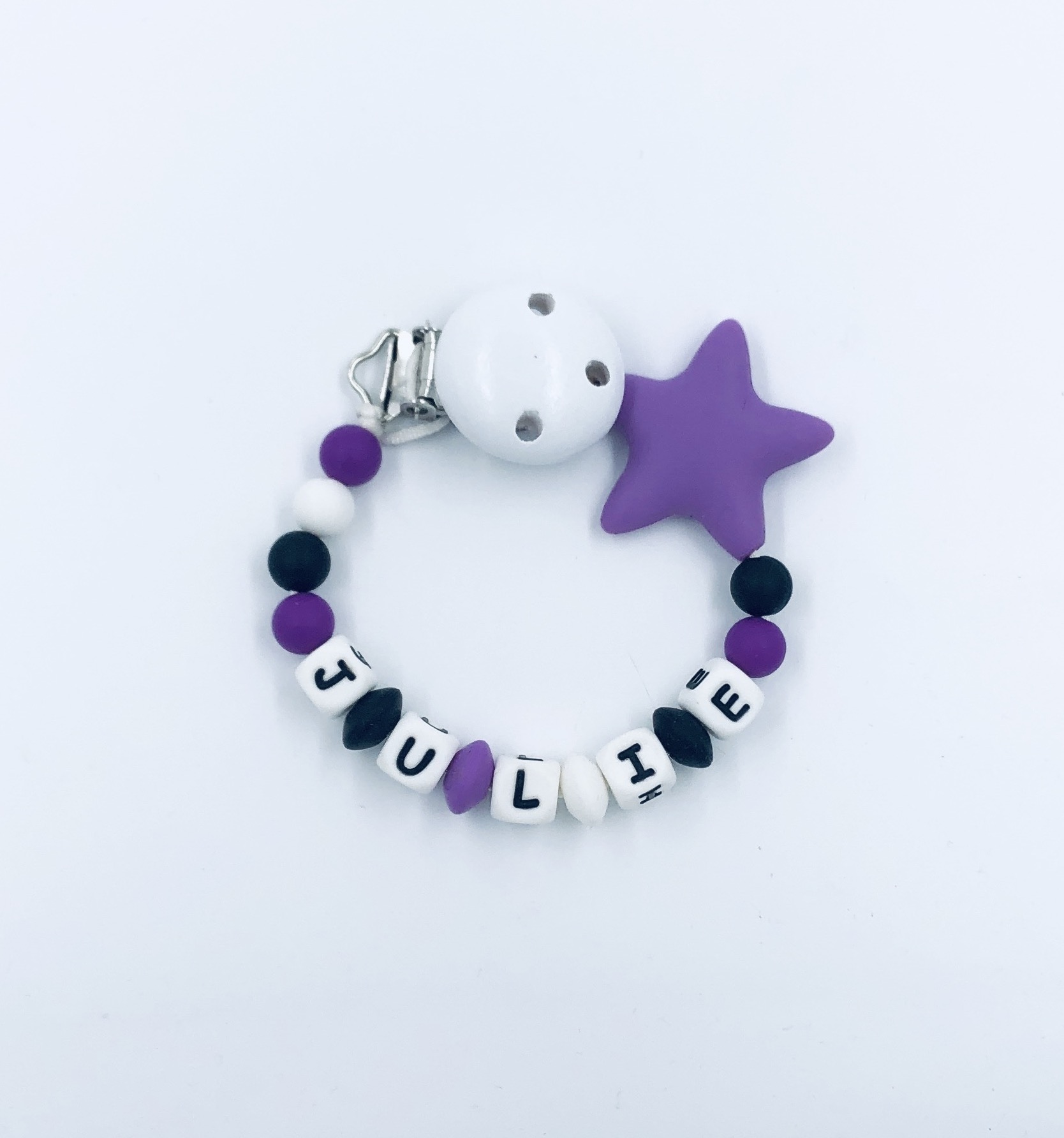 Le kit création attache sucette étoile violet à personnaliser est un cadeau original et unique à offrir pour une naissance ou un anniversaire. N’oubliez pas d’indiquer le prénom lorsque vous passez commande d’un kit création attache tétine personnalisée.