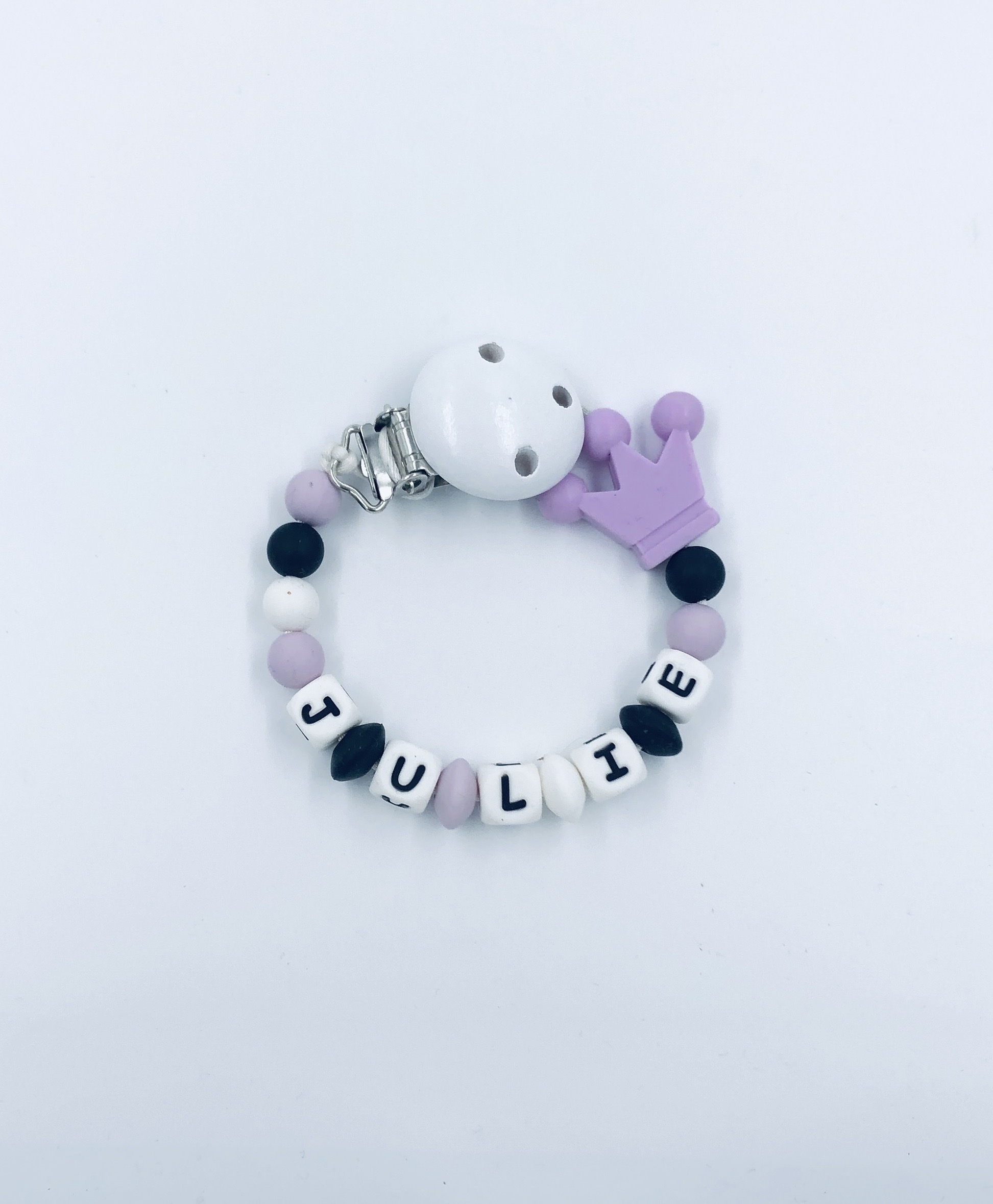 Le kit création attache sucette petite couronne violette pâle à personnaliser est un cadeau original et unique à offrir pour une naissance ou un anniversaire. N’oubliez pas d’indiquer le prénom lorsque vous passez commande d’un kit création attache tétine personnalisée.