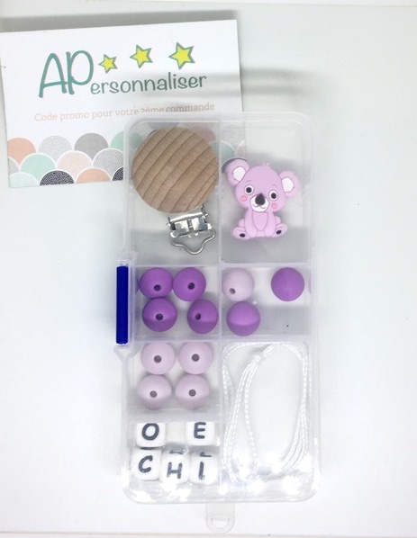 Le kit création attache tétine koala violet à personnaliser est un cadeau original et unique à offrir pour une naissance ou un anniversaire. Noubliez pas dindiquer le prénom lorsque vous passez commande dun kit création attache tétine personnalisée.
