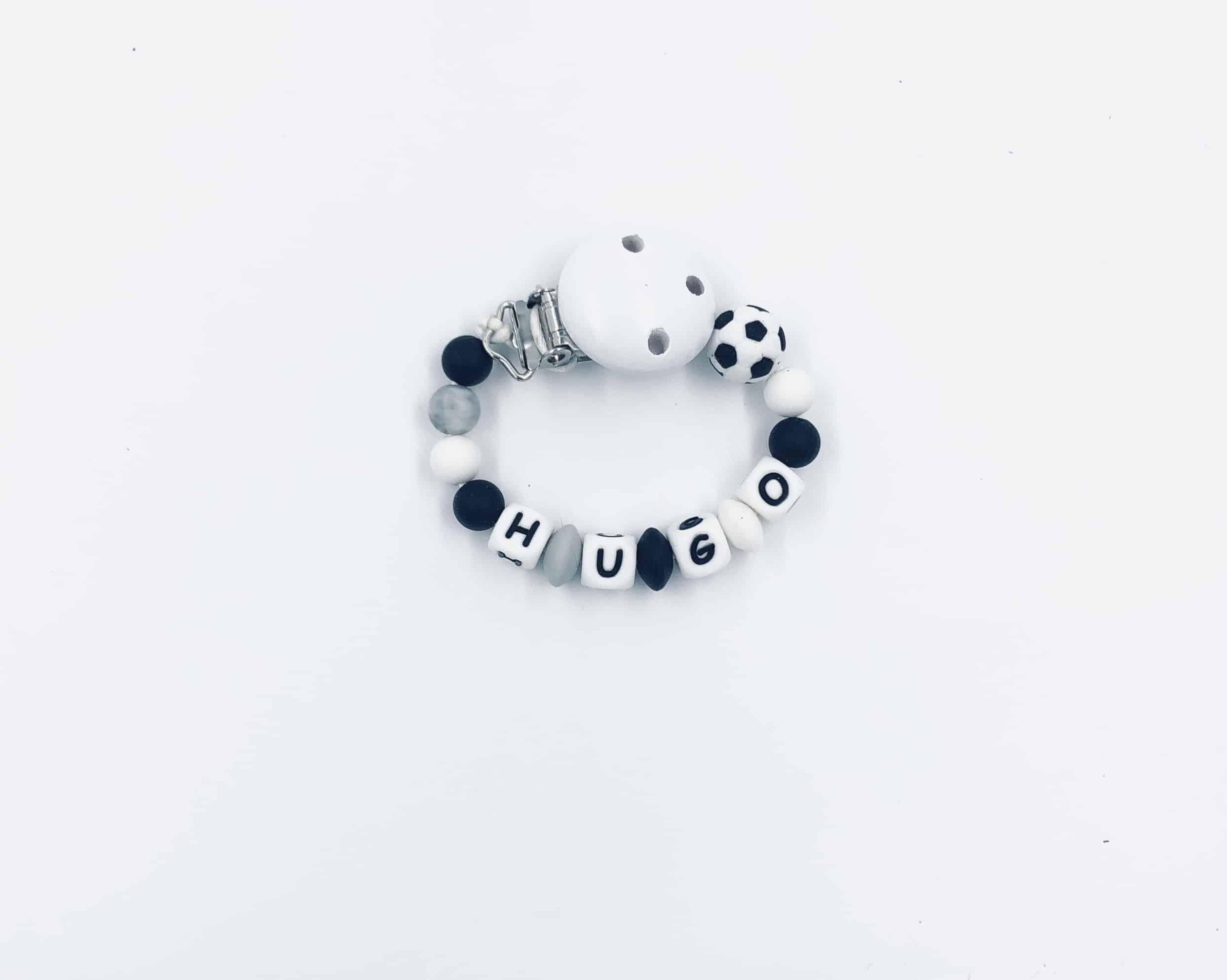 Le kit création attache tétine ballon de football noire à personnaliser est un cadeau original et unique à offrir pour une naissance ou un anniversaire. N’oubliez pas d’indiquer le prénom lorsque vous passez commande d’un kit création attache tétine personnalisée.