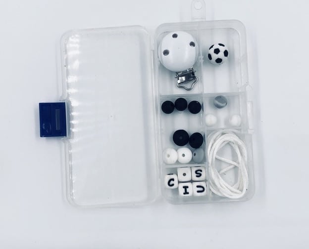 Le kit création attache sucette ballon de football noire à personnaliser est composé de perles de dentition :