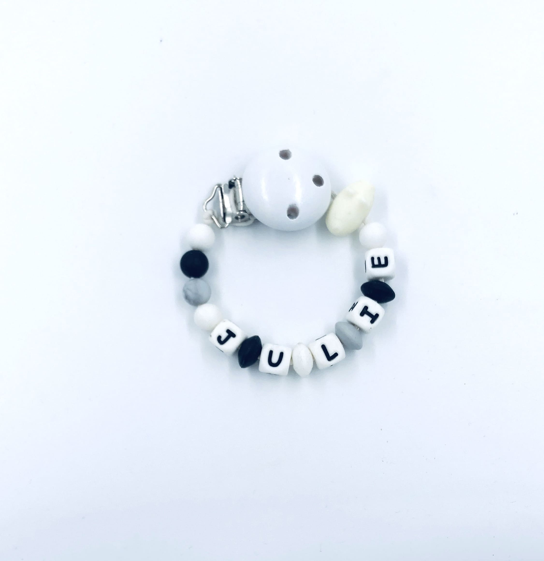 Malgré toutes nos précautions pour concevoir des articles personnalisés pour bébé de qualité et respectant les normes européennes. Il se peut que les lettres ou les perles présentent des défauts. N’hésitez pas à nous contacter pour nous le signaler. Ou si vous avez besoin de renseignements complémentaires sur nos produits.