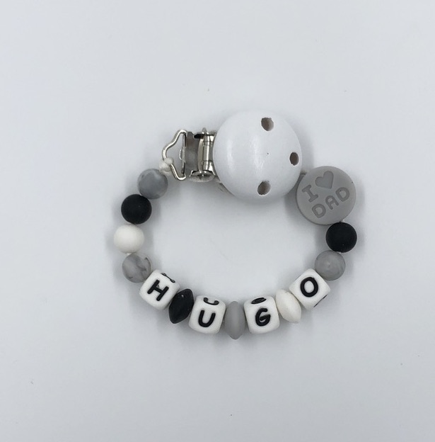 Le kit de création d’attache sucette I love dad gris clair avec prénom est composé de perles en silicone et d’un rond I love dad et Mom. L’attache est un clip en bois.