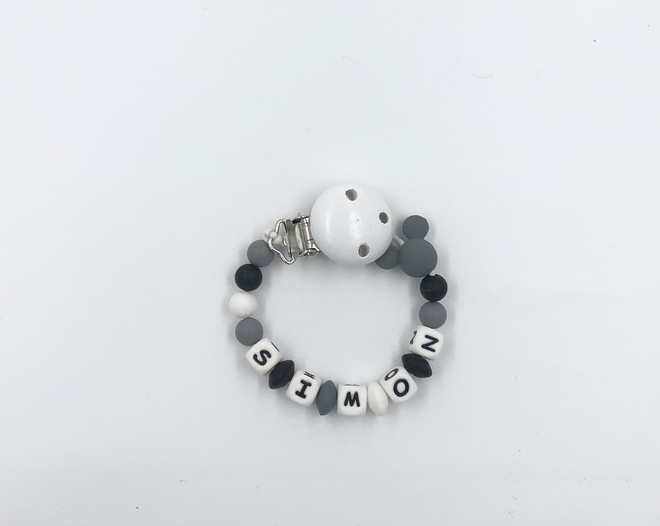 Le kit de création d’attache sucette grise souris avec prénom est composé de perles en silicone et d’une souris. L’attache est un clip en bois.