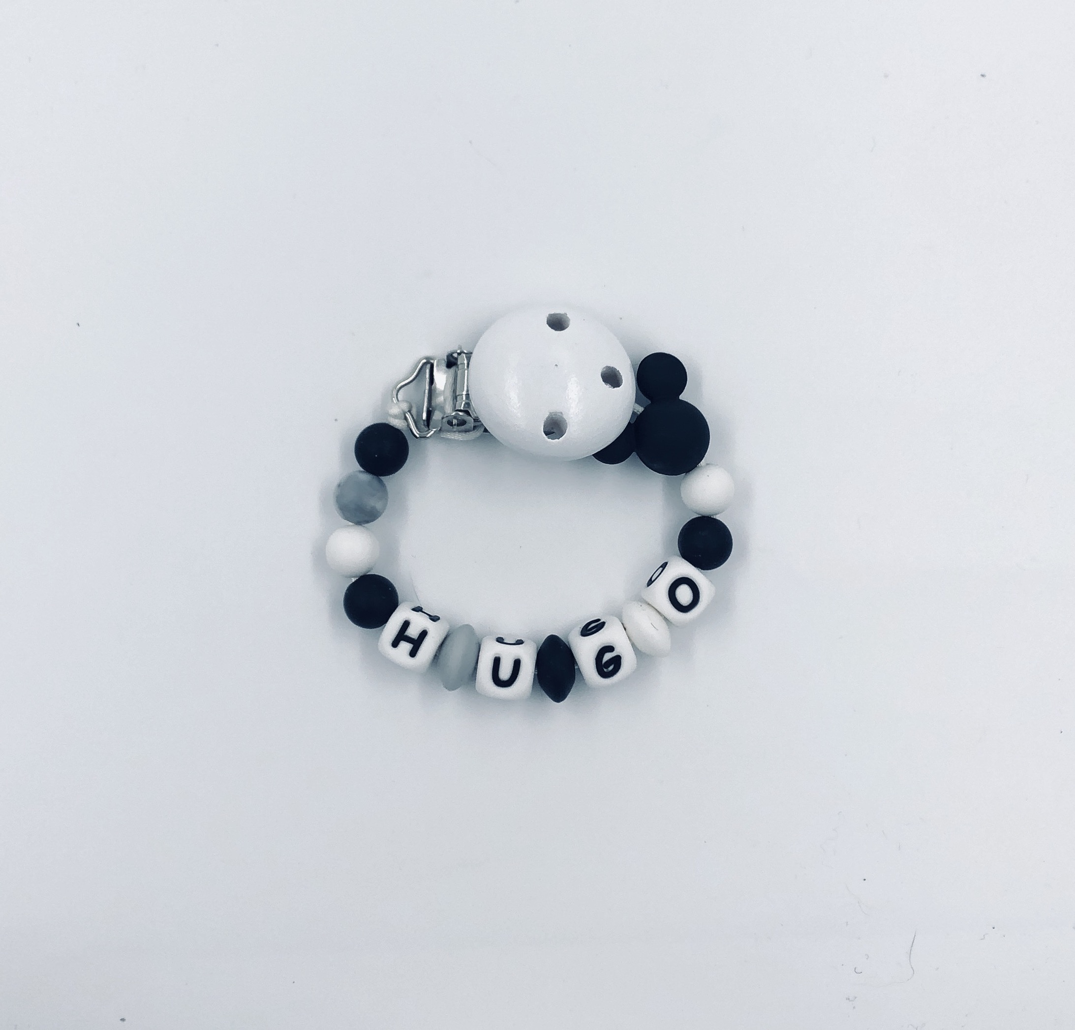 Le kit création attache tétine souris noire à personnaliser est un cadeau original et unique à offrir pour une naissance ou un anniversaire. N’oubliez pas d’indiquer le prénom lorsque vous passez commande d’un kit création attache tétine personnalisée.