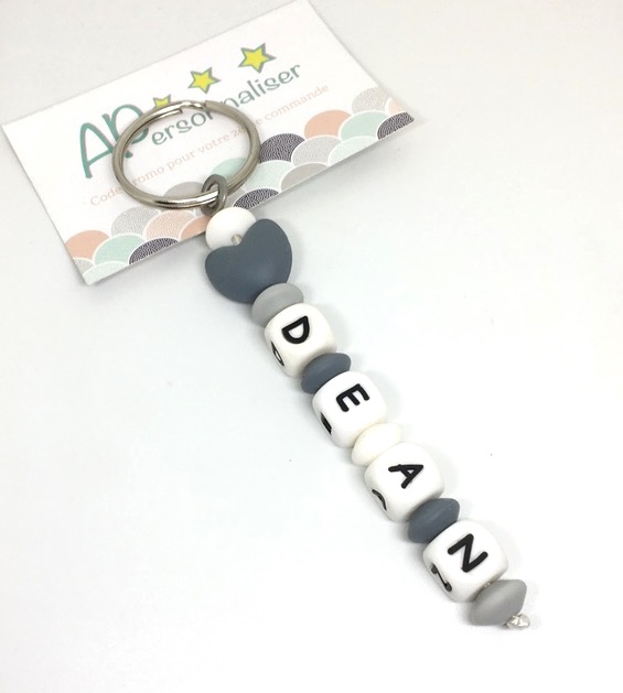 Le porte clés gris à personnaliser est composé de perles de dentition :